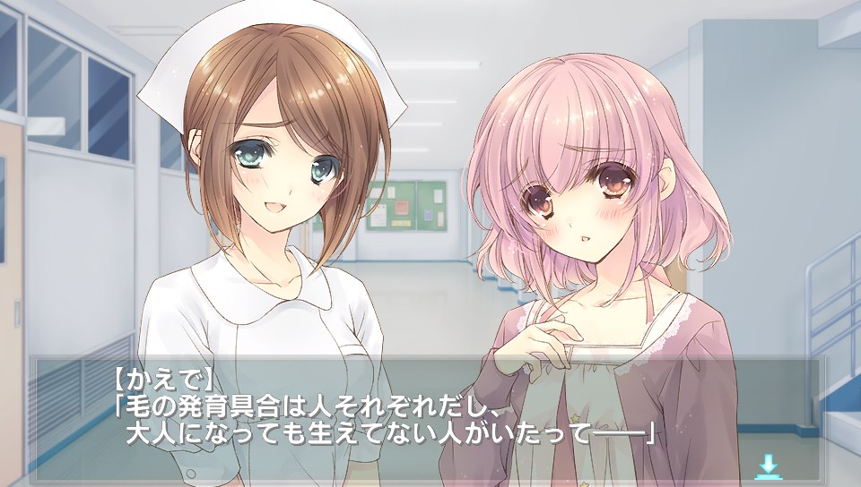 我还是要承认,自己就是喜欢萌妹子。早濑老师的画风甜美让人不能自拔,色彩的感觉较为清淡,每一个角色都有其主色。人物的服装无论私服还是护士服,设计及配色都赏心悦目。我不会画画,不太懂怎么形容,总之看起来很舒服,与百合题材的游戏是非常搭配的。人物立绘的表情细节处理也相当到位(比如あすか的撅嘴动作),相比前作,我更喜欢本作的画风。