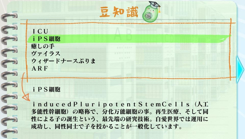 接下来说说「豆知識」。这个子系统囊括了本作世界中出现的专有名词,有医疗术语,也有剧情设定。然而这个系统有一点不足,微博上某位朋友提到,如果一段话里出现一个心目的豆知识,按三角只能直接进入第一个,总之就是比较鸡肋。上图显示的“iPS细胞”在本作世界中被成功运用至同性生子这一领域。有人觉得这个设定太过“方便”,但既然世界观是虚构的,这项科学技术在“现代”背景下也不会格格不入,我认为没什么问题。相比之下,后面要提到的“超能力”才是真正让人喷饭的设定。