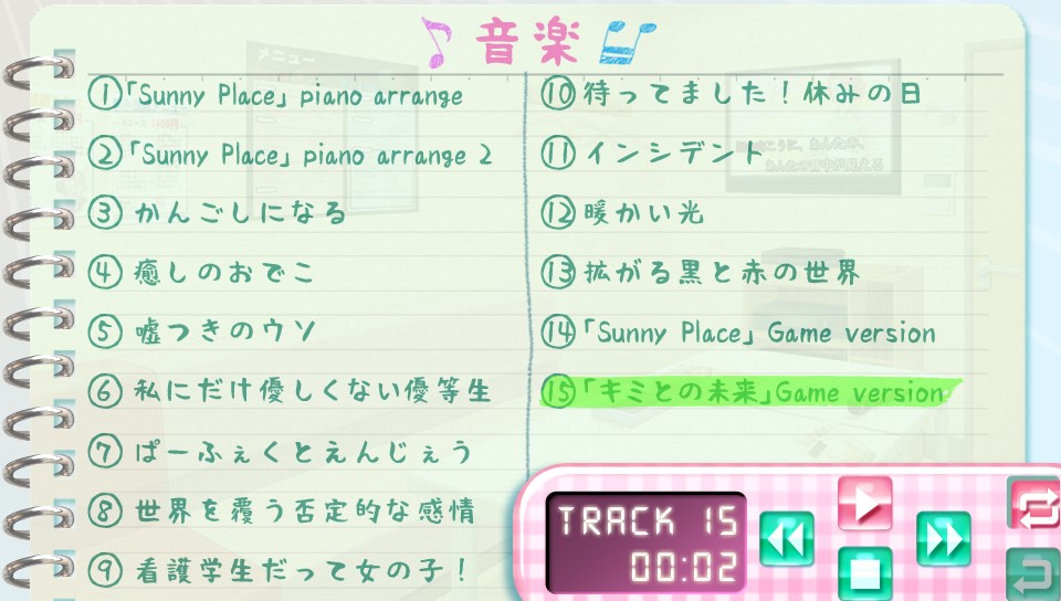 每通完一条个人线,回到标题画面时都是该线的角色念游戏标题,不同的结局还会有相应的变化,比如なお的Bad End是喘息着念。「憩い場」(休息处)也会新增一段声优的感想录音,内容还是比较有趣的,各位声优都很可爱。另外,音乐播放界面自然也是少不了的。